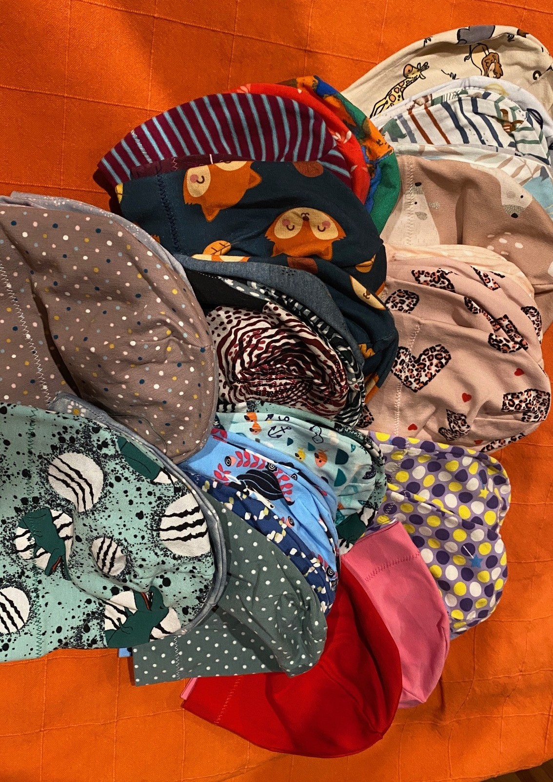 Herzlichen Dank für die schöne Stoffspende von Vroni Esterer, bunte Jerseystoffe für Babymützerl. Cilli, Tina und Moni haben wieder fleißig gestrickt, herzlichen Dank euch dreien!