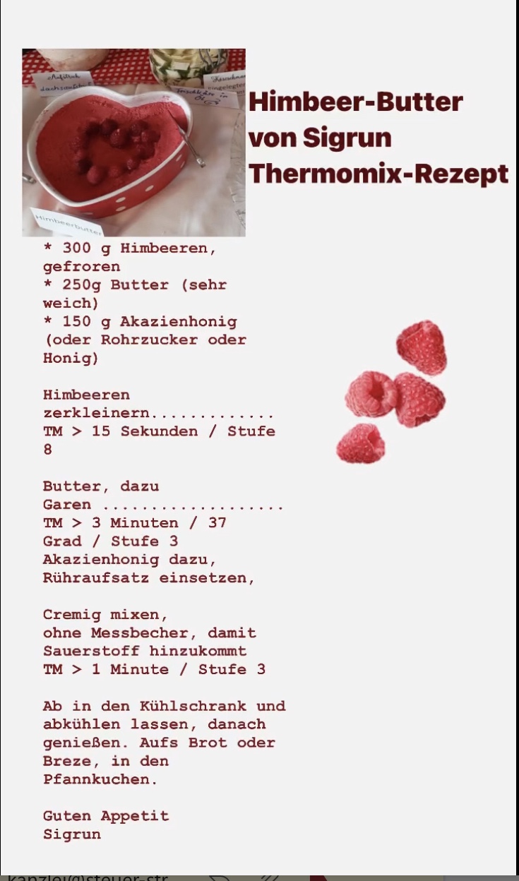Hier kommt das Rezept der süßen Himbeerbutter von Sigrun <<hier drucken>>