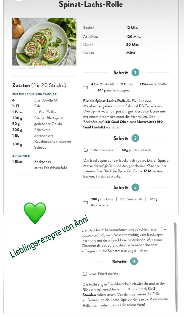 Und von Anni Kamysek kommt die Spinat-Lachs-Rolle <<hier zum Ausdrucken>>